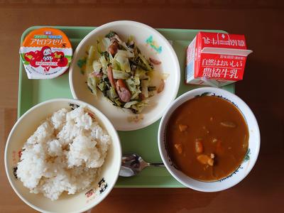 2020年12月1日 11時36分ウインナーとキャベツのソテー、アセロラゼリー付きです。今日は平第三小学校のリクエストメニュー。栄養たっぷりのメニューを残さず食べて、コロナに負けない体を作りましょう、とのメッセージです。やっぱり、リクエストはカレーですよねぇ。
