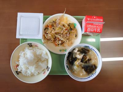 2020年12月2日 11時43分もやしと豚肉の油炒め、若布の味噌汁です。和風献立ですね。納豆には様々な栄養素が含まれています。子どもたちの成長には欠かせないものがほとんどですし、大人にとっても生活習慣病防止に役立ったりしますので、よくかんで、食べましょう。