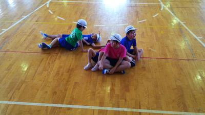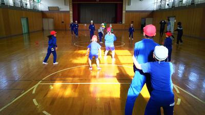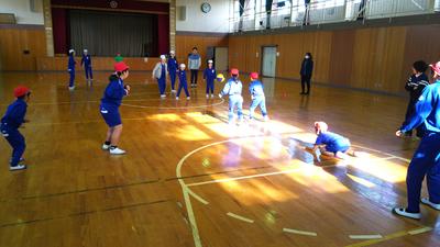 2019年11月25日 10時13分けろっぴの顔を緑色にしてあげるため(?)に、体育館でまず走った子どもたち。走り終えてしばし休憩です。
