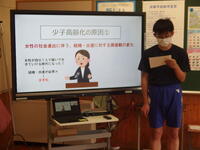 ・自作のパワーポイントで、少子高齢化の原因や今後の取り組みについて、幅広い視点で考えて発表しました。