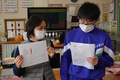 さて、授業の様子へ。中2の英語。昨日行った「Question Time」の集計結果を先生方に公表です。グラフ化したものを英語で説明しました。自分の意見を交えながら上手に発表できました。