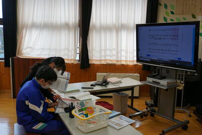 中2音楽の時間。デジタル教科書を活用し、「早春賦」の学習を進めました。