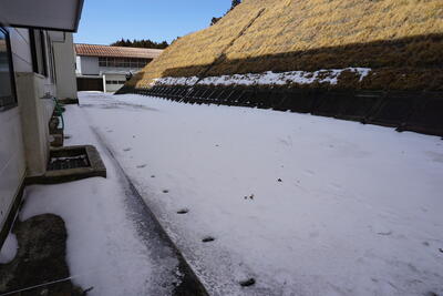 校舎裏の様子はご覧の通りです。日陰になるため、年末からの雪が残り、深いところでは、膝下まで雪に埋まります。