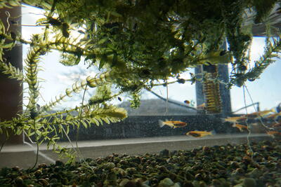 そんな寒さの中でも、命が育まれています。水槽ではメダカたちが矢大臣山を背に、元気に成長しています。