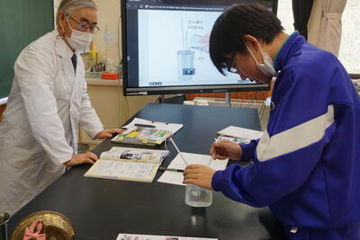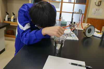 中2理科の時間。水の入ったコップの表面に水滴がつくのは、中の水が何度になったときかを確認しています。