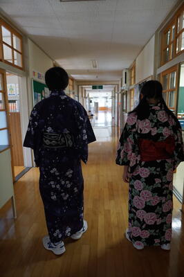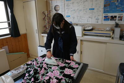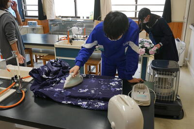 家庭科の時間。夏に着る浴衣にアイロンをかけています。2人ともアイロンがけは初体験のようです。丁寧に作業をしていきます。
