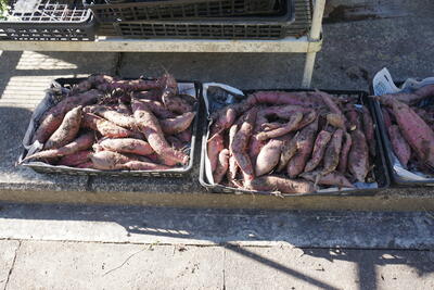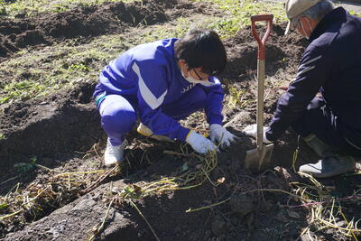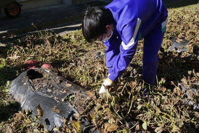 芋のつるを鎌で切り、マルチを外して芋掘りの準備完了。