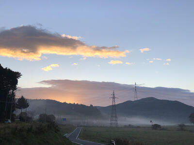 今朝の学校前の風景です。東の稜線から朝日が昇っています。とても神秘的な光景でした。