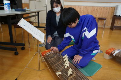 まずは中学1年生の音楽の授業です。琴で「さくらさくら」の演奏にチャレンジしていました。