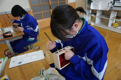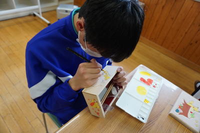 中学3年生は、美術でオルゴール箱の制作をしています。絵付けに入り、完成までもう少し。それぞれの好きなキャラクターなどが描かれています。完成が楽しみです。