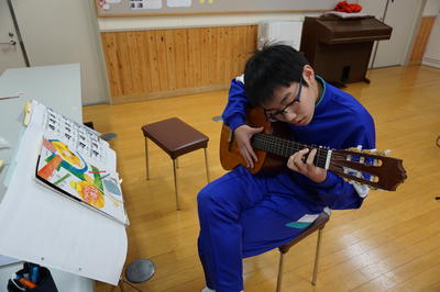 中学1年生は、先週の「琴」に続き、「ギター」の演奏を行いました。左指がなかなか思い通りに動きませんでしたが、先生のアドバイスでいくつかのコードを覚え、少しずつ演奏できるようになりました。チャレンジしている曲はこれまで文化祭等でも歌ってきた「カントリーロード」です。