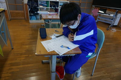 次に3年生の学活の授業です。今年一年を振り返り、一人一人が「今年の漢字」を選びプリントに書いていました。受験に向けて日々努力を続けている3年生にとって、これまでの自分を振り返る貴重な時間になっていたようです。