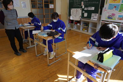 中学3年生は英語の学習です。日本の昔話を紙芝居にして発表するための原稿作りや読む練習を行っていました。実際の発表は年明けになるそうですが、今からとても楽しみです。