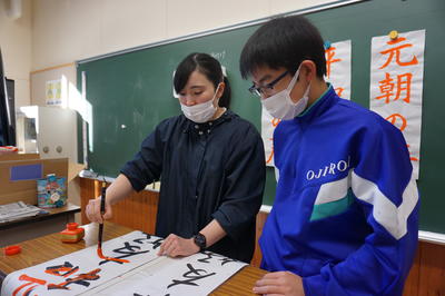 年明けの書き初め展に出品する作品の練習を行いました。それぞれの課題は小6「元朝の海」、中1「平和友好」、中3「歓喜の声」です。1月12日の書き初め大会で仕上げます。