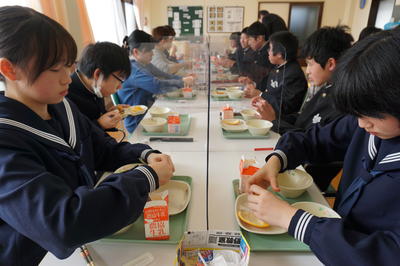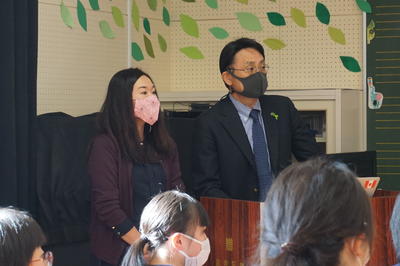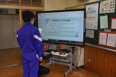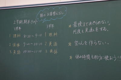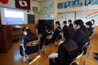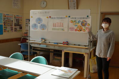 さらに・・・川前中、桶売中の生徒さんをお見送りした後は、栄養教諭による食の指導がありました。テーマは「冬休みの食事」についてです。カルシウム不足にならないために毎日牛乳1本は飲むことと、バランスのよい食事と3食をしっかりとること大切さを学びました。また、正月のおせち料理について説明がありました。
