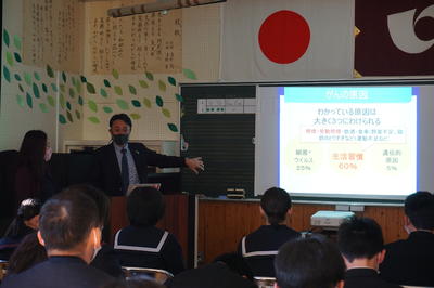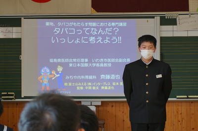 2日の4校時目に、講師は、齊藤道也(みちや内科・胃腸科理事長)先生と西郡里美(福島労災病院看護師長)先生のお二人をお招きし、川前方部の中学校合同で薬物乱用防止教室を、本校にて実施しました。
