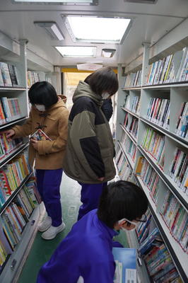 10日(木) 移動図書 冬休み中に読みたい本を真剣に探しています。受験勉強で読書の時間がなかなかとれない3年生も、気に入った本を見つけていました。