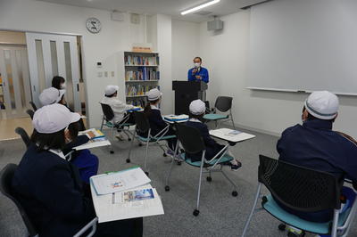 到着後、はじめにスタッフの方から、震災についてのお話をいただきました。災害に関する映像を見て、災害時にどのように行動すべきなのか学びました。