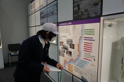 次に館内見学をしました。震災当時の様子が分かる写真や資料、展示を見て、地震や津波の被害の大きさを知ることができました。