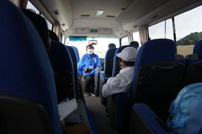 全員でバスに乗車し、現在の薄磯地区を見ながら、震災当日の様子についてお話ししていただきました。