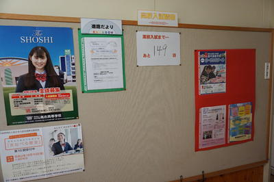 今週は2学期中間テストが実施されます。生徒達は、朝の時間を有効活用し、学習に取り組んでいました。また、今年は3年ぶりの受験生を抱える本校ですが、今年設置された「進路コーナー」には、受験までの日数も表示されるようになりました。「受験は団体戦」といわれることもあります。受験生としてお互いの苦悩を分かち合いながら、日々の学習に取り組んでほしいと思います。