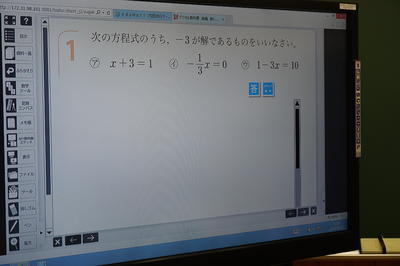 中学1年生の数学です。「一次方程式の活用」をデジタル教科書を利用して授業を進めています。
