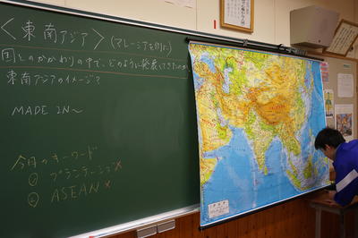 中学1年の社会です。「アジア州」の学習で、マレーシアを例に東南アジアについて学んでいます。