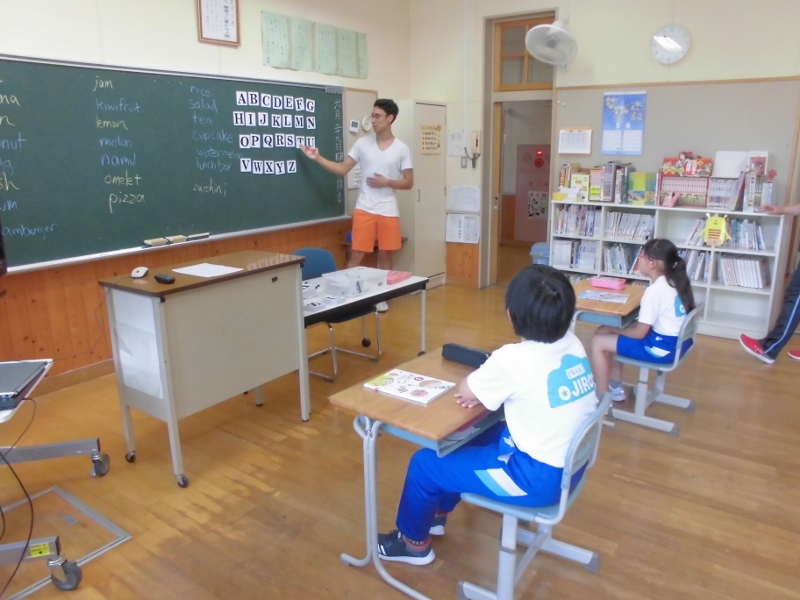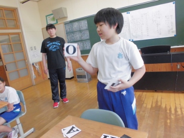 最初はALTの先生に続いて、発音と文字の形を確かめていきます。その後はABCの歌に合わせてみんなで一緒に歌って覚えました。