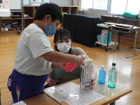 土曜授業で、小学生は午前中にぶどう園に行ってきました。ぶどうの手入れのしかたを教えてもらい、ジベレリンの作業をしました。