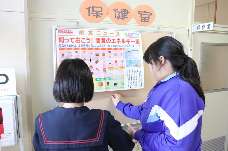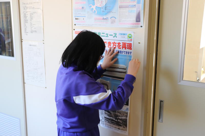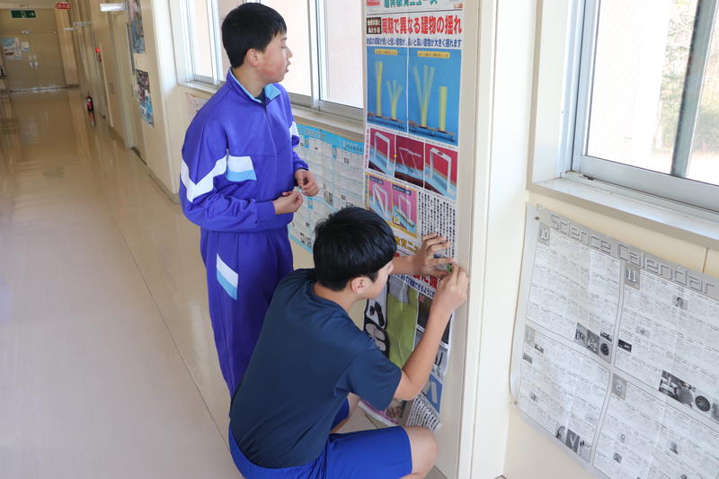 本校では、全校生とが協力して校内のポスターを貼り替えます。この日の出席者は5名、少ない人数で校舎全体のポスターを貼り替えました。