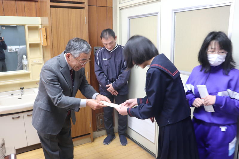 今年度も生徒達は、川前地区防犯標語に作品を応募しました。川前地区青少協の会長様より、その記念品を一人一人に授与して頂きました。ありがとうございました。