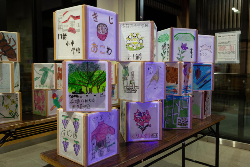 本日午後3時より、「クリスマス屋台 in 川前駅前」が、川前支所の主催で行われました。川前地区全小中学校では、昨年度より、この川前町賑わい創出事業に参加し作品を制作してきました。今回、夏に行われた屋台に引き続きクリスマスにちなんで開催されました。今年度全児童生徒が制作した行灯が、駅の待合室内に再び飾られました。