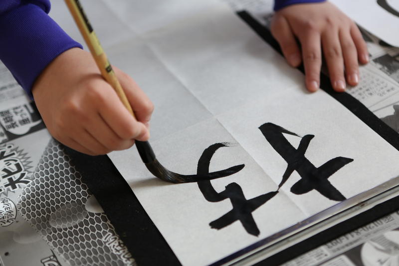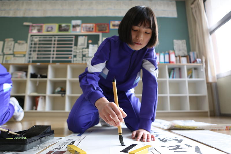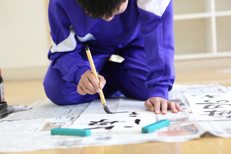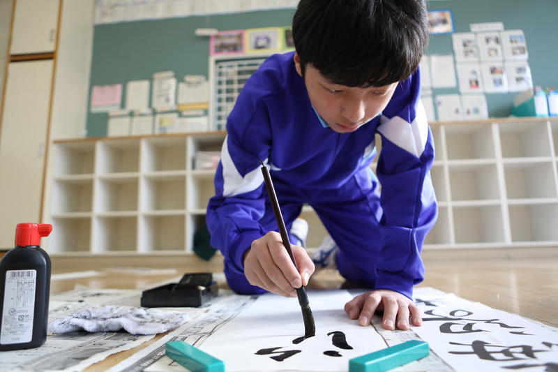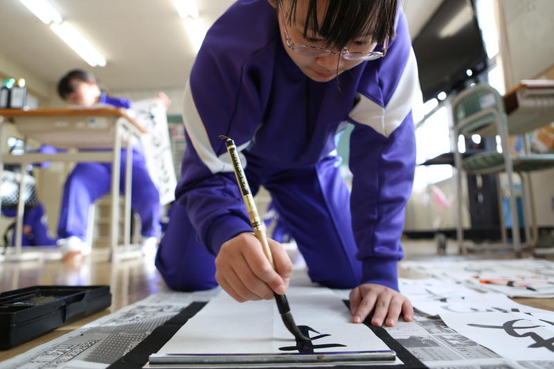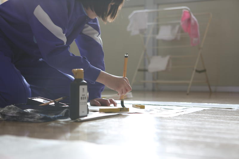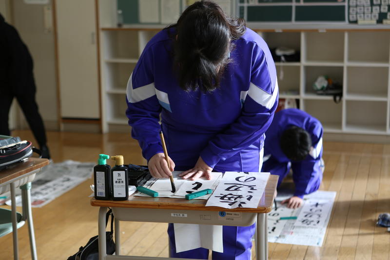 只今、県の書きぞめ展に向けて、作品の制作を行っております。生徒達はそれぞれの書きやすい場所で、それぞれの想いをのせて、紙に向かっています。