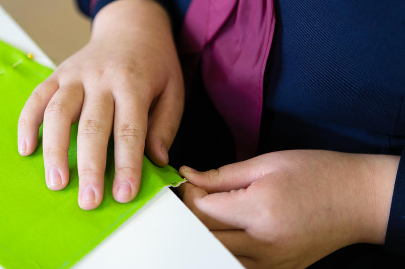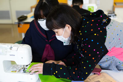 の大変さが分かったでしょうか。現在、家庭科の授業では裁縫の学習をしています。制作しているものは「箸箱入れ」です。今日は裁断した布を縫い合わせる作業を行いました。