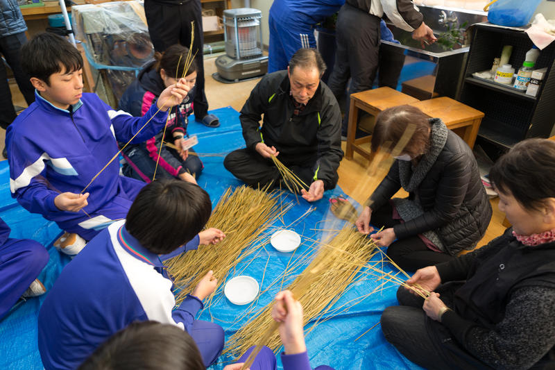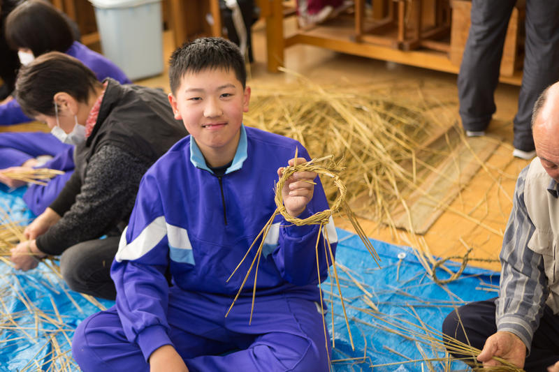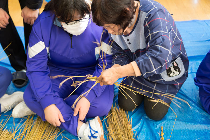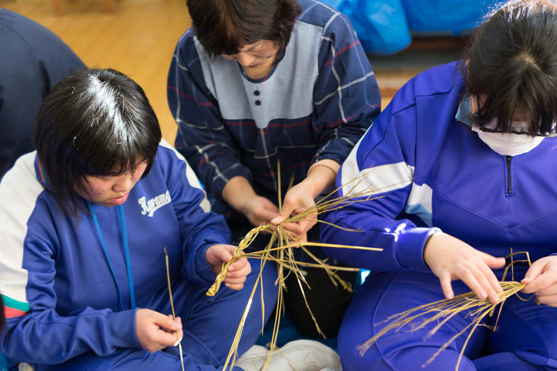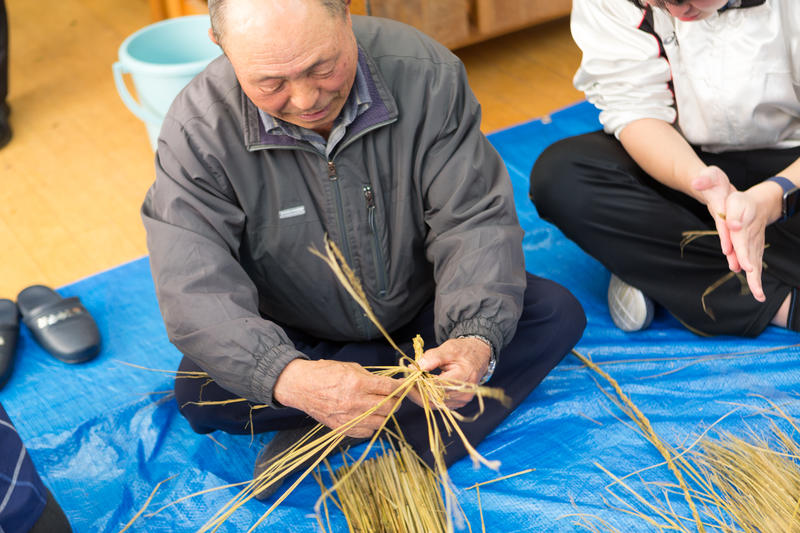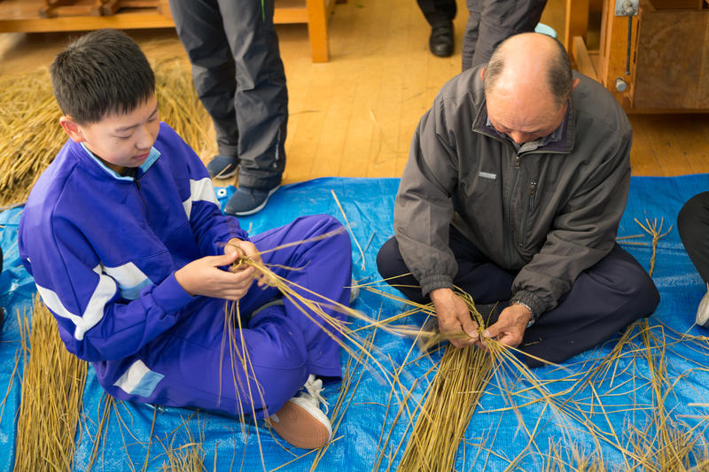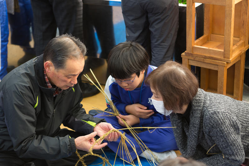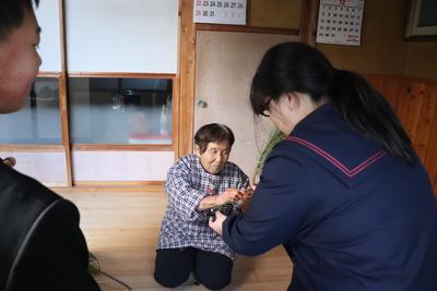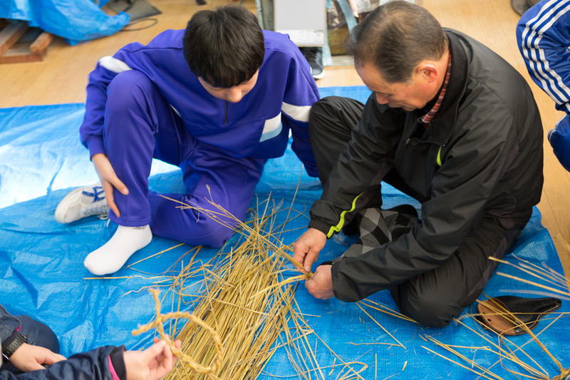 生徒達は、地域の方々と一緒に縄を捩る(もじる)作業を行いました。地域の方々は楽しい会話を交えながら、生徒達に懇切丁寧に教えてくれました。