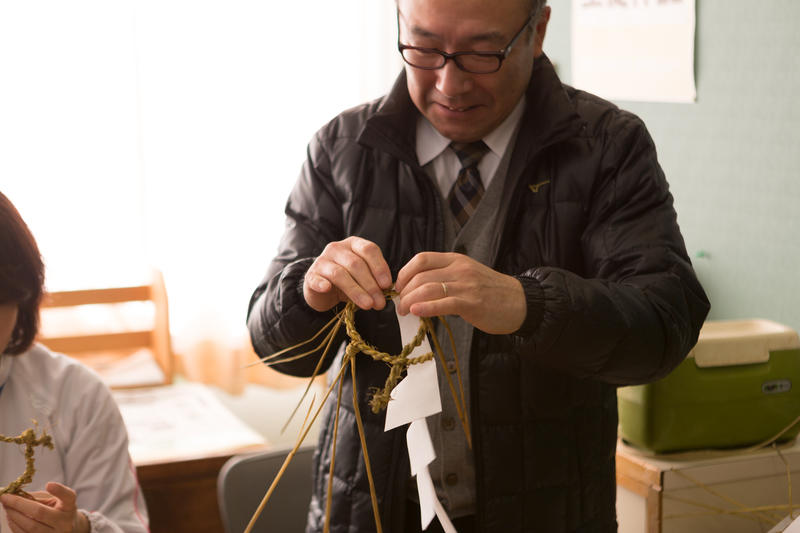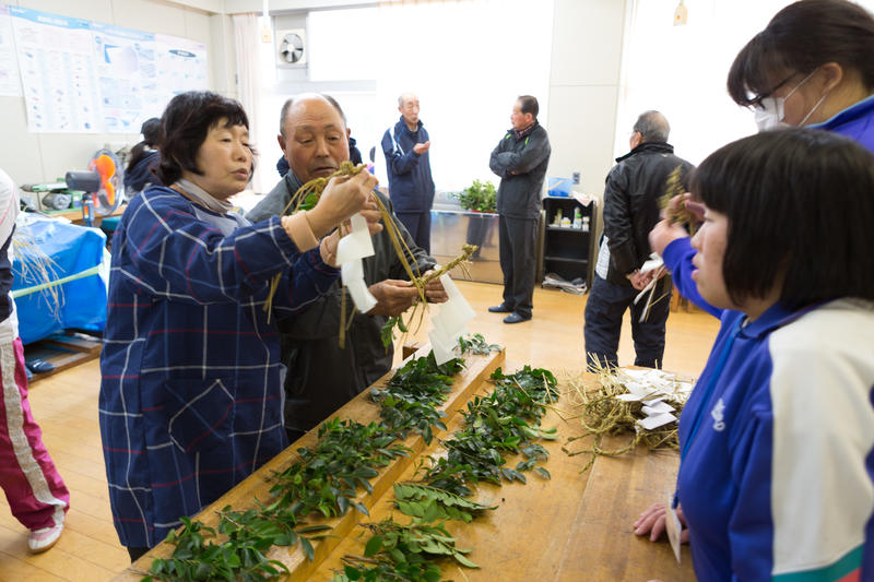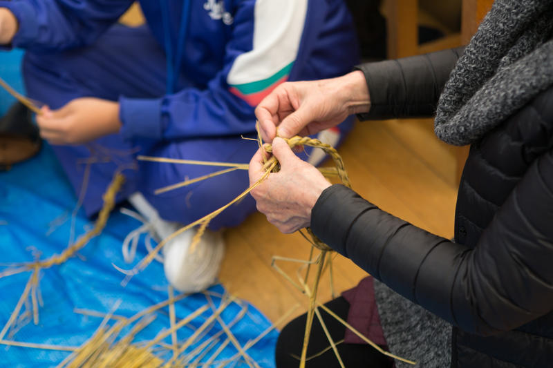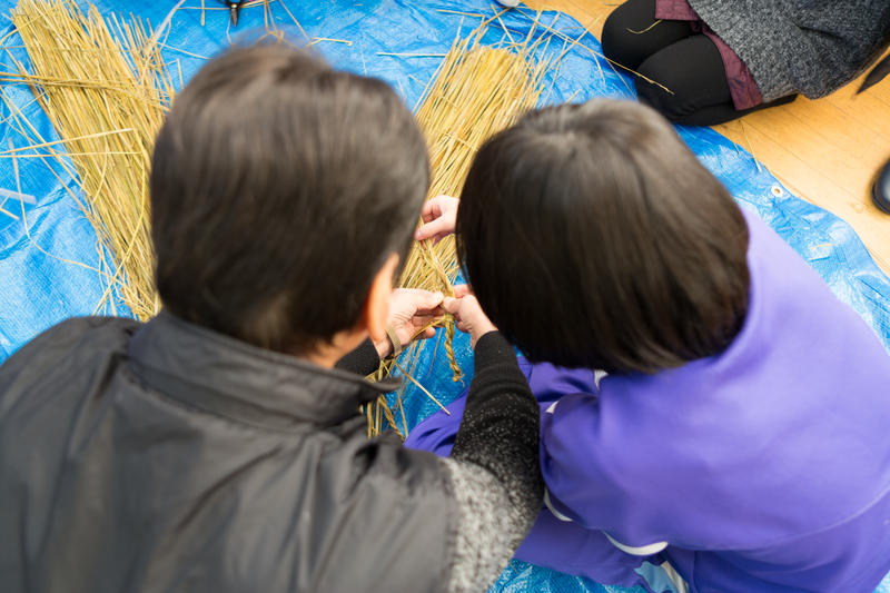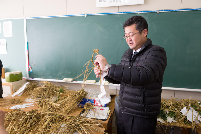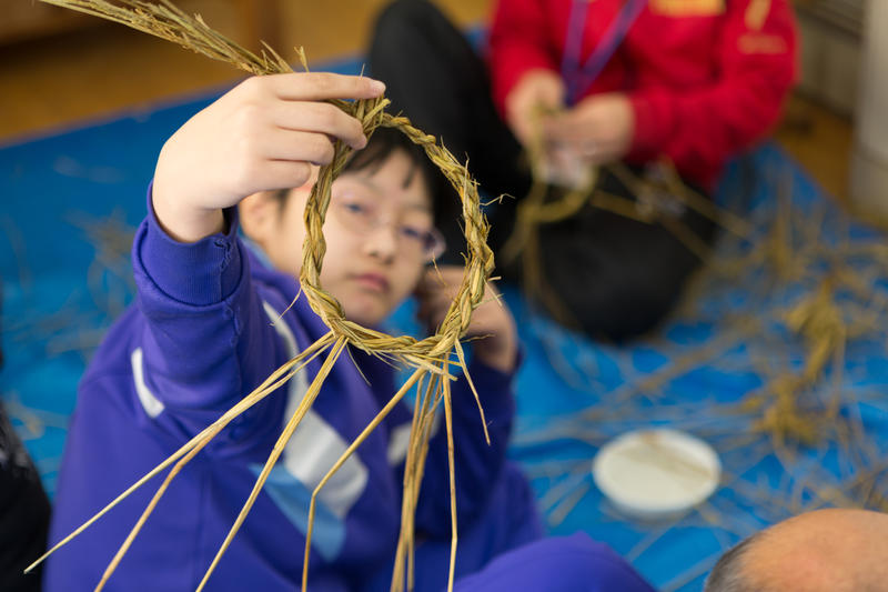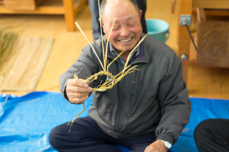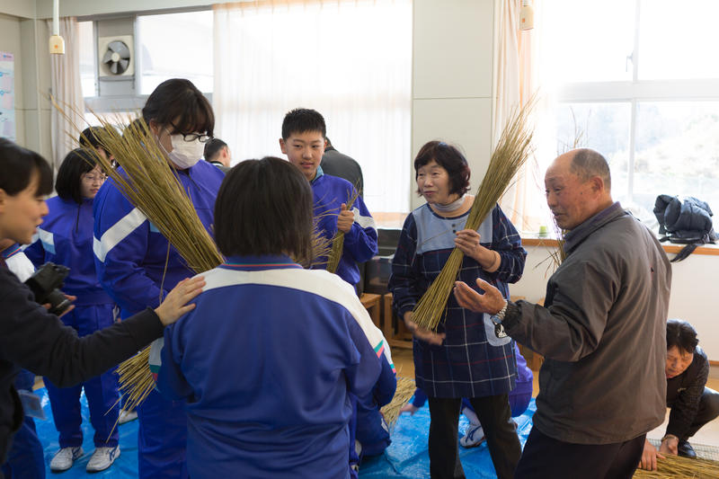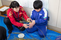 生徒達は、地域の方々と一緒に縄を捩る(もじる)作業を行いました。地域の方々は楽しい会話を交えながら、生徒達に懇切丁寧に教えてくれました。