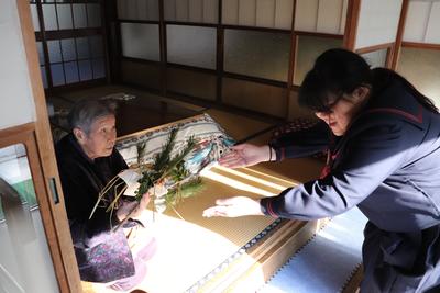 昼食の後は、ふれあい訪問です。一人暮らしのお年寄りのお宅へ訪問し、お飾りをプレゼントしました。