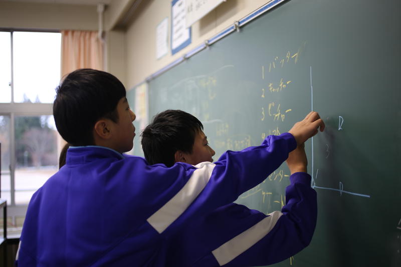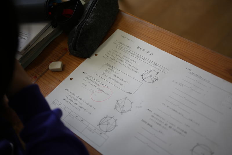 3年生の数学。円周角の定理を学習しています。円周角の定理を活用する、難しい証明問題に取り組みました。一生懸命、証明を考え記述しました。