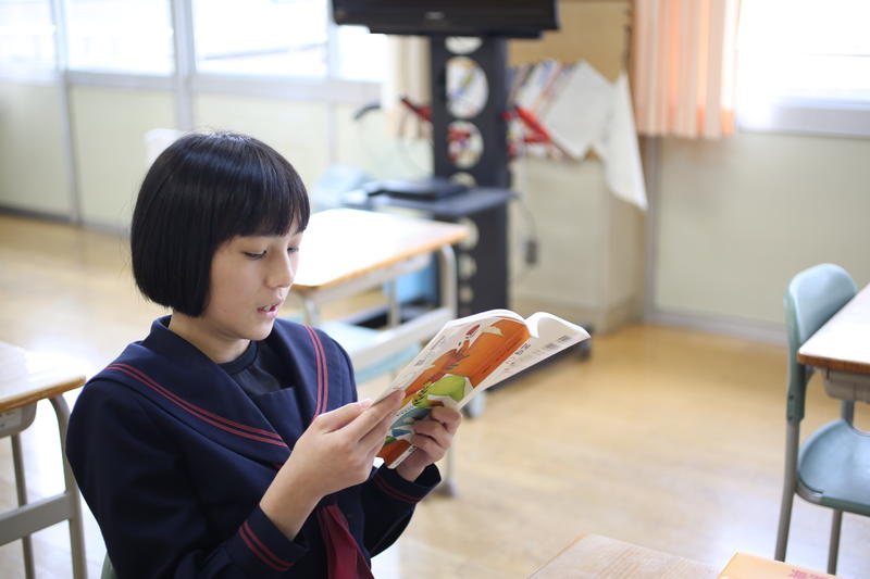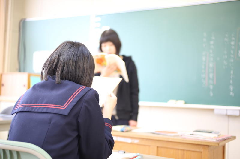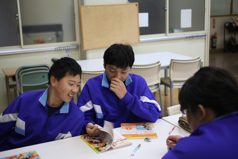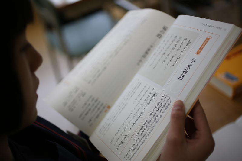 2年生は国語です。平家物語に親しむ授業でした。先ず、平家物語の背景について学習し、その後先生と一緒に何度も音読しました。最後はスムーズに作品を読むことができました。