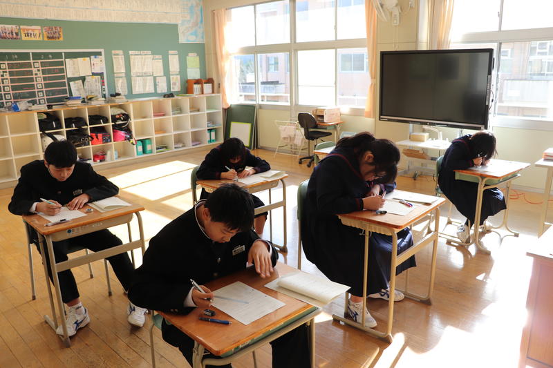 本日2学期期末テストの最終日となりました。本校はリスニングのある教科以外は1~3年生まで同じ教室でテストを受けます。お互い刺激し合って、真剣にテストに取り組みました。