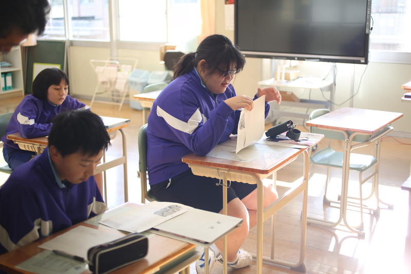 1学年は英語です。プリントに書いてある短い文章を読んで、それに関する質問に答えます。その答えを担当の先生に英語で伝える授業でした。