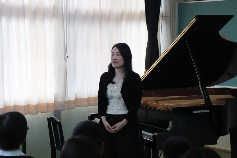 今回演奏してくださったのは、ピアニストの木田麻貴さんです。木田さんはいわき市出身の方で、4年前にも桶売中学校に来ていただいた方です。
