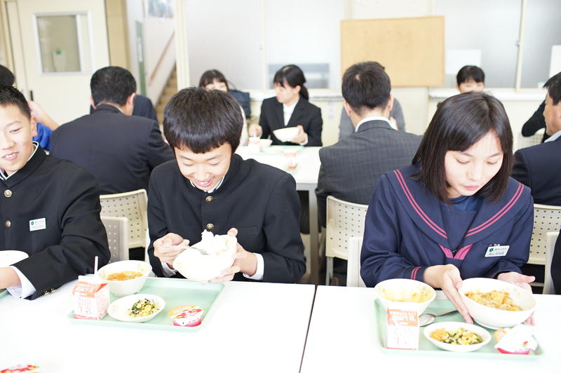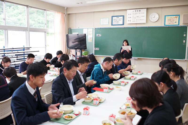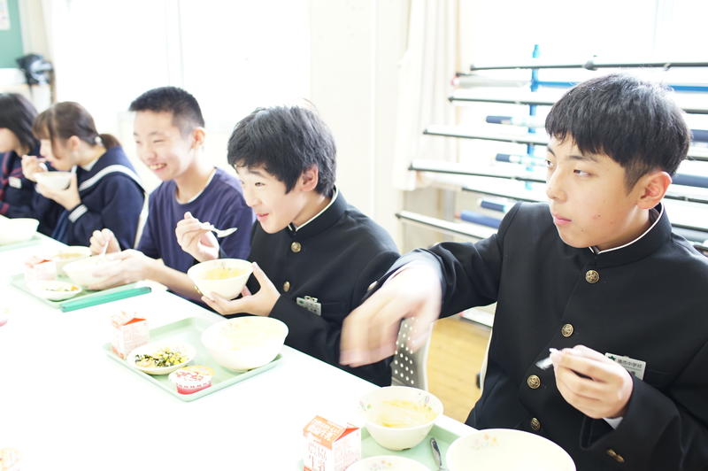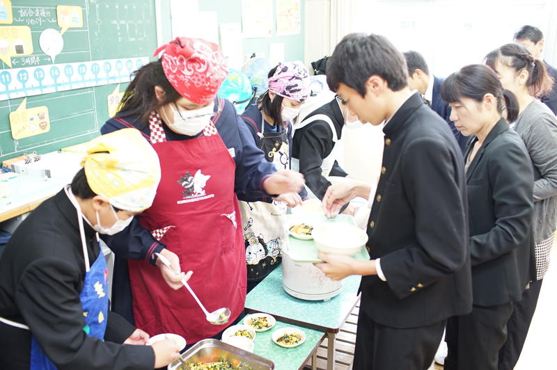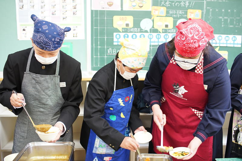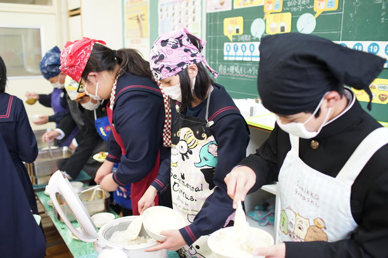 おでかけアリオスの後は、川前地区三校合同で給食を食べました。いつもより多い給食の量となるので、その分食缶も多くなります。桶売中の生徒だけでなく、川前中や小白井中の生徒も一緒に準備を行いました。