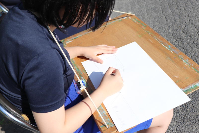 今日の1時間目は、全学年合同での美術の授業でした。生徒たちは、前回学習した「一点透視図法」を用いて、学校の風景をデッサンしました。