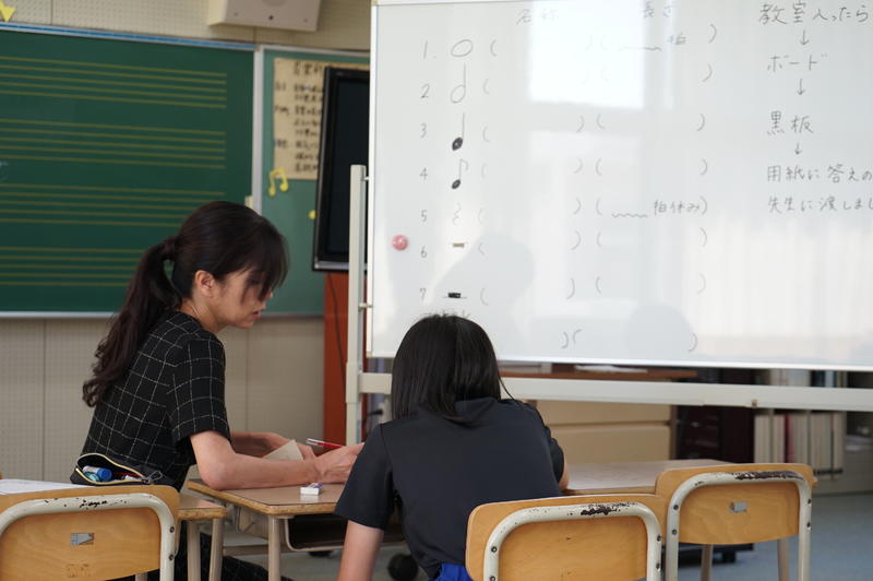 2年生の音楽の時間では、楽譜の読み方を学習しています。普段楽譜に接することの少ない本校の生徒達。そのペースに合わせてゆっくりと授業が進みます。