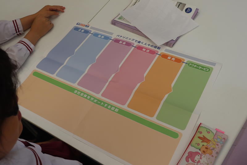 次に、働く人の役割に注目してみました。生徒は、パナソニック株式会社で働く人の役割を、分野毎に分ける活動を行いました。一つの商品が流通されるまでに、非常に多くの人が関わっていることがわかりました。