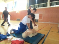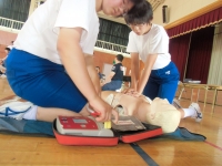 本校では、万が一に備え、今の時期に毎年行っている講習会で、中学生と小・中学校の教職員が参加しました。