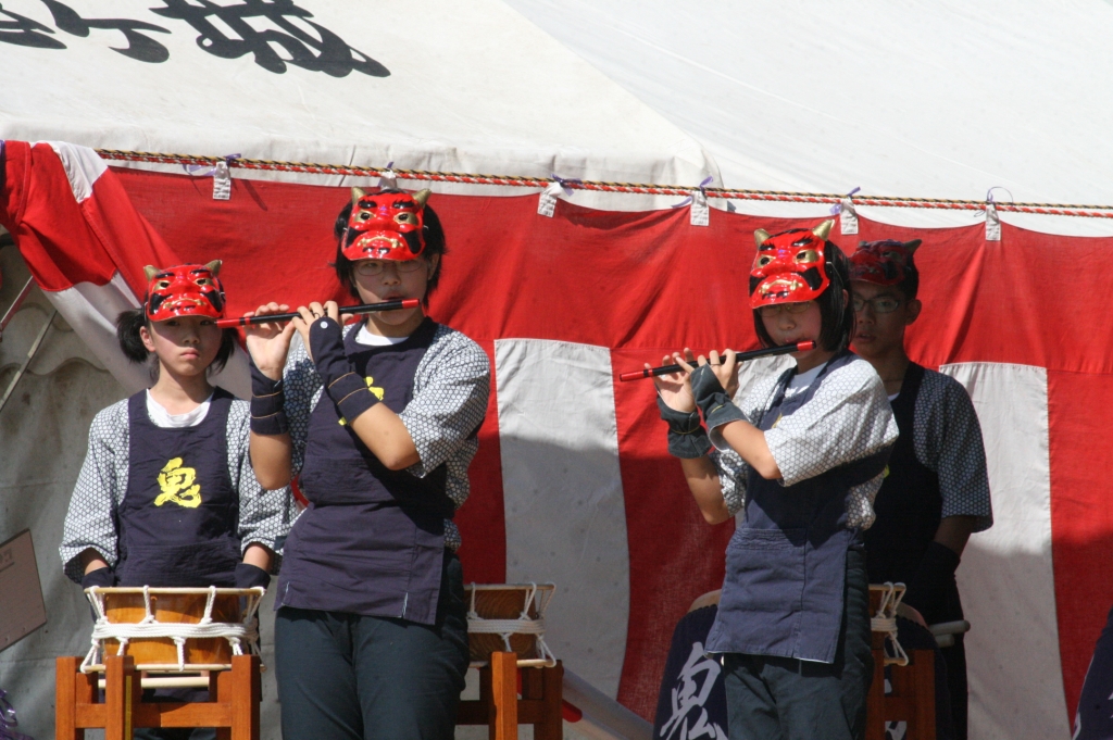 屋外での演奏で、直射日光による太鼓の皮や笛のひび割れを心配し、何より響いた音を鳴らせるかという不安で、はじめは生徒たちの表情も硬かったのですが、宇佐見くんの前口上が始まると、キリッと引き締まった表情に変わりました。