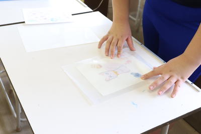 完成した絵はラミネート加工し、サイズを調整して行燈の側面にはめ込みます。