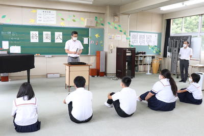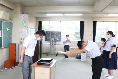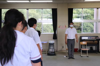 生徒指導主事からは「相手のことを考えた対応・言葉かけ」について話がありました。新型コロナウィルス感染者への差別や中傷がニュースで見受けられます。誰に対しても同じ行動がとれるかが大事ではないでしょうか。自らの行動を今一度考えてみるきっかけとしてほしいです。